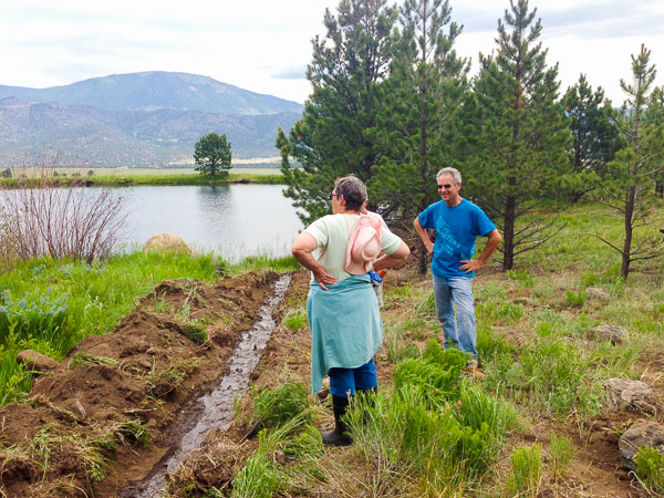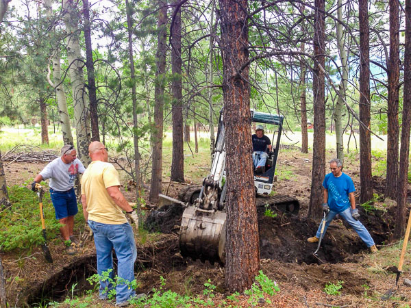 Thanks to all those that came out to help with our cleanup day last month! We concentrated on cleaning up around the pond and the Four Elk Creek drainage. A backhoe was rented and Mike and Lynn’s son Alan did the driving. The creek was rerouted around the decaying water feature at the pond and a lot of trees and bushes were removed to help with the flow. Here are some pics thanks to Heidi Dineen.